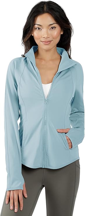 Nude Tech Material. This womens jacket is made of our Nude Tech fabric, which is light, airy, and soft. It’s composed of 88% Polyester and 12% Spandex. This specially designed cozy zip-up promotes full coverage and airflow while preventing overheating. Our fashion jacket has thumb holes on each sleeve to keep them in place and increase hand coverage whether you’re working out or on a run. The high zip-up neck adds a chic cozy touch and provides additional warmth to this workout jacket.