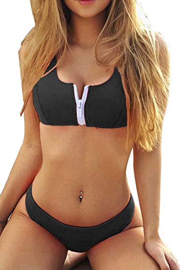 Sunfury Women Zipper Front Crop Top Low Waist Sporty 2PCS Bikini Sets Bathing Suit