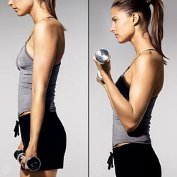 Hold medium-heavy weights and curl the weights up for 8 reps. For the next 8