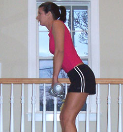 and dumbbells close to the body. Squeeze butt to raise up and, still at a slight