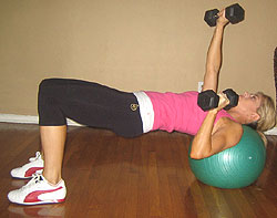 Lie on a bench or ball with medium-heavy weights. Start with elbows bent and