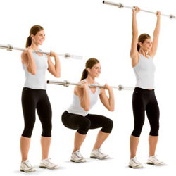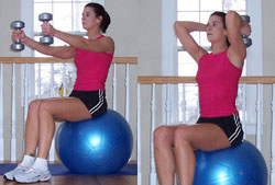 stand up and push the weights overhead. Repeat the series for 12-16 reps.