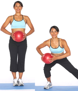 Hold a medicine ball or dumbbell and take the feet wide, toes slightly out.