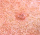 begins as a small firm, painless lump or patch on the skin that slowly enlarges.