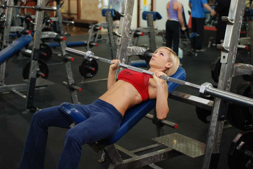 - Lower the barbell slowly until it slightly touches the pectorals.