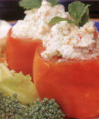 Slice off the tops of the tomatoes. Scoop out the pulp and